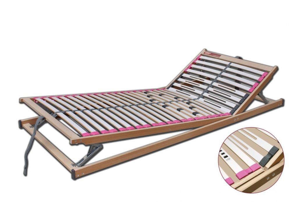 Lamelový rošt s polohováním hlavy a nohou. Rošt má 28 lamel uchycených v kaučukových pouzdrech, jejichž anatomické uspořádání kopíruje křivky těla a má příznivý vliv na polohu těla při spánku. V oblasti ramen jsou lamely podélně prořezány pro větší pružnost a komfortnější spánek na boku. Rošt má různé úrovně polohování podle momentálních potřeb uživatele. Kombinací tohoto roštu a vhodné matrace je dosaženo výborných ortopedických vlastností. Středový popruh zajišťuje zvýšenou stabilitu roštu. Tento rošt je vhodný pro všechny typy matrací, které lze polohovat (latexové, ze studené pěny, z líné pěny….). Celková výška roštu je 5 cm. Nosnost roštu je do 120 kg.Doplňkové parametry