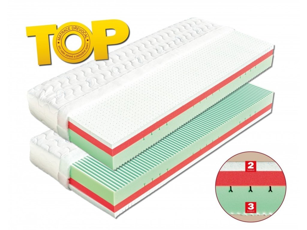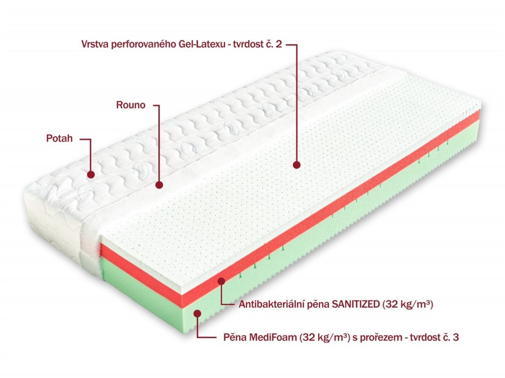 Matrace s volbou dvou tuhostí nabízí skvělý komfort a přizpůsobivost. Měkčí strana (tuhost č. 2) je tvořena perforovaným Gel-Latexem, který díky mikrokapslím se speciálním gelem poskytuje příjemný chladivý efekt. Tento materiál je měkký, tvarově stálý a vyniká výbornými termoregulačními vlastnostmi – efektivně odvádí vlhkost. Jeho anatomické vlastnosti ještě více podpoří středová tyrkysová pěna MediFoam (35 kg/m³), která je velmi elastická.