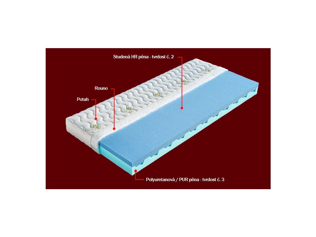 Konstrukce matrace je tvořena dvěma elastickými pěnami s rozdílnou tuhostí. Měkčí stranu tvoří studená HR pěna (40 kg/m³), která vyniká poddajností, elasticitou a výborným přizpůsobením tělu. Naopak světle modrá pěna MediFoam (35 kg/m³) na druhé straně poskytuje pevnější ležení s tvrdostí č. 3.