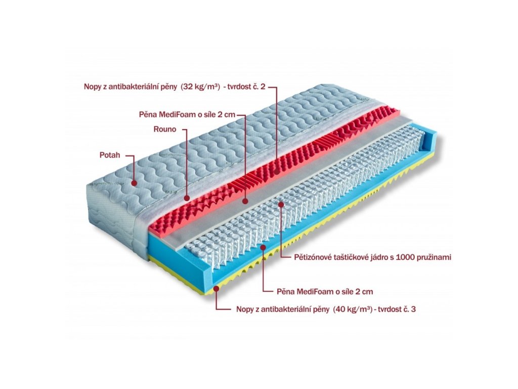 Vrchní komfortní vrstvy tvoří pěny dvou tuhostí s antibakteriální úpravou Sanitized, která poskytuje trvalou ochranu proti bakteriím, roztočům a plísním. Pro zvýšení komfortu jsou podloženy roznášecí vrstvou o výšce 2 cm.