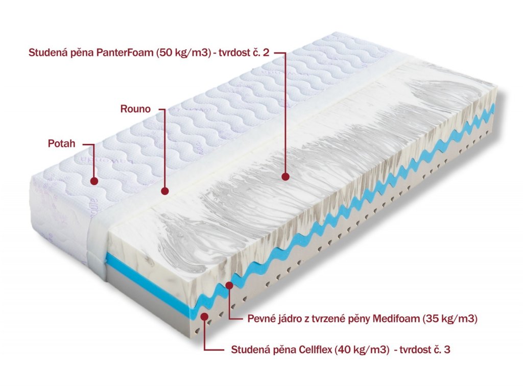 Poddajnější stranu tvoří moderní pěna PanterFoam (50 kg/m³), která se vyznačuje výjimečnou elasticitou, skvělou prodyšností a dlouhodobou tvarovou stálostí. Díky vysoké hustotě poskytuje nadstandardní pohodlí a odolnost i při dlouhodobém používání.
