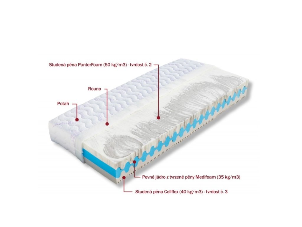 Vrchní, poddajnější stranu matrace tvoří značková pěna PanterFoam (50 kg/m³), známá svou vysokou hustotou, pružností a dlouhou životností. Poskytuje měkký a přitom stabilní povrch pro klidný spánek bez přetěžování těla.