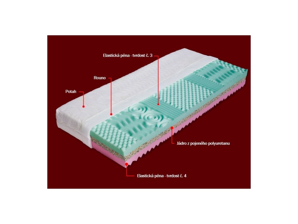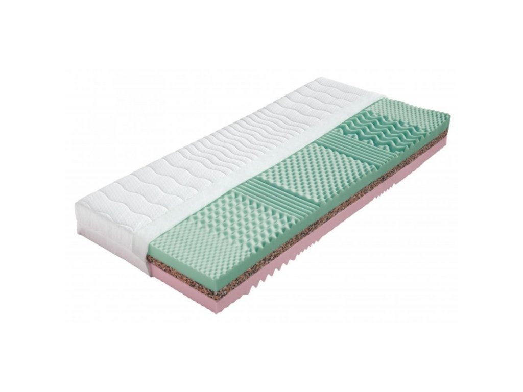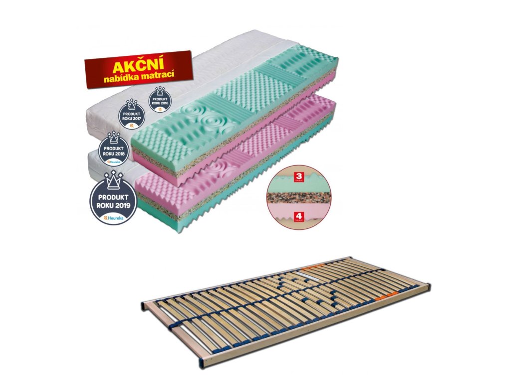 Střed jádra je zpevněn pojeným polyuretanem, který zvyšuje nosnost matrace na 140kg. Obě ložné plochy jsou tvořeny kvalitními elastickými pěnami Medifoam, různých tuhostí. Povrch ložných ploch je vytvarován do masážních nopů. Tyto nopy jsou rozděleny do 7 anatomických zón a zabezpečují prokrvení pokožky a uvolnění svalů během spánku. Matrace je vhodná pro všechny typy roštů (lamelové, laťkové, polohovatelné). Celková výška matrace cca 22 cm. Maximální nosnost je 140 kg. Plus v akčním balíčku s lamelovým roštem Systema Fix, který má 28 lamel uchycených v kaučukových patkách s možností nastavení tuhosti a nosností roštu do 120 kg. Rozměry obou produktů jsou 200x90 s potahem matrace Aloe vera.Doplňkové parametry