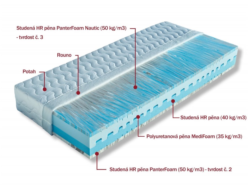 Jádro matrace tvoří profilovaná studená HR pěna (40 kg/m³) ve spojení s pěnou MediFoam (35 kg/m³). Ložné plochy jsou tvořeny dvěma typy pěn PanterFoam (50 kg/m³): šedou pěnou s vysokou elasticitou a tvarovou stálostí a modrou pěnou PanterFoam Nautic, která má navíc antibakteriální úpravu chránící proti bakteriím a roztočům.